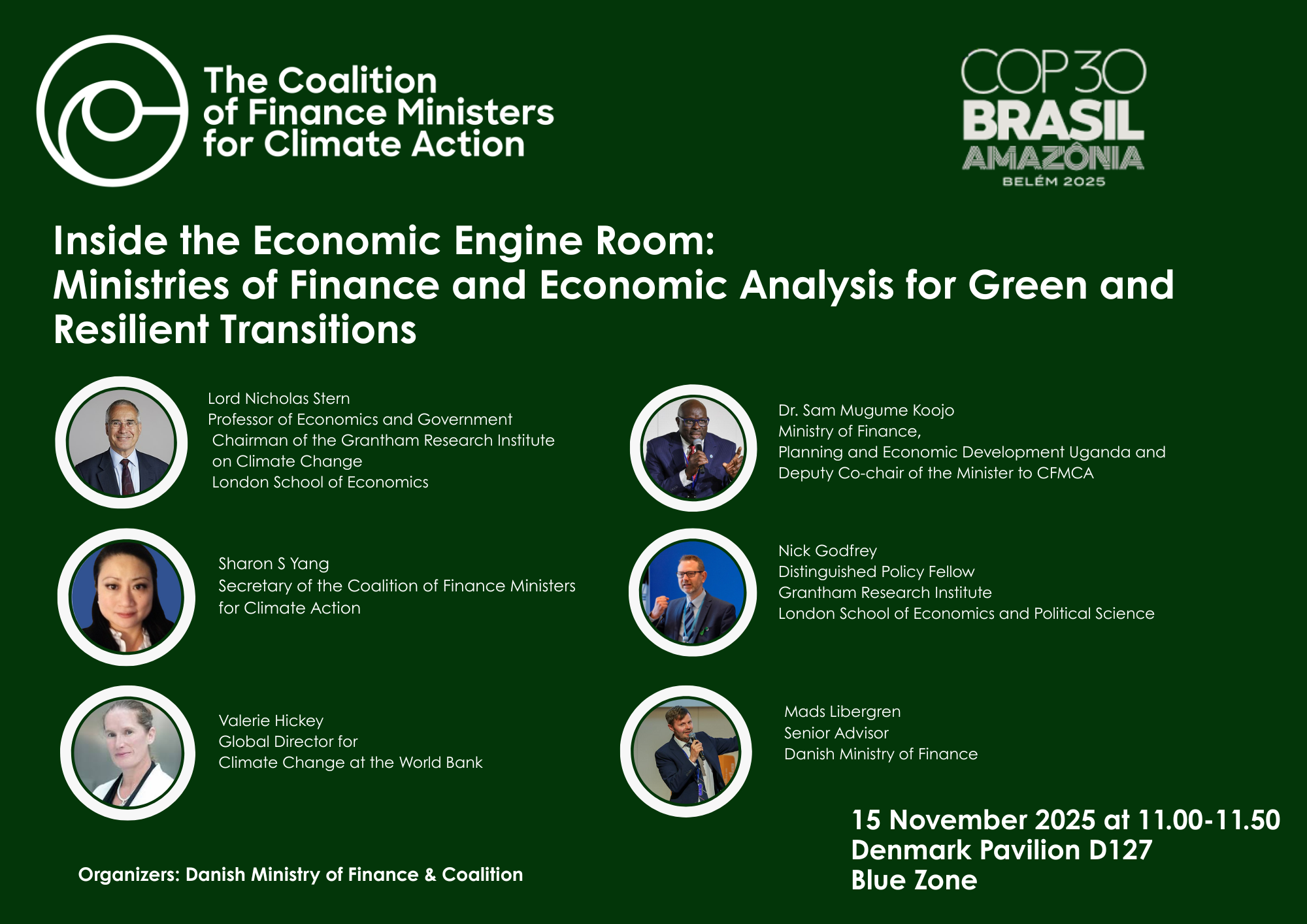 The Coalition of Finance Ministers for Climate Action’s Helsinki Principle 4 (HP4) workstream, led by the Danish Ministry of Finance, drives work on mainstreaming climate action into economic and fiscal policies and tools. At COP30, the Coalition will present insights and country experiences from the Coalition’s Economic Analysis for Green and Resilient Transitions Initiative, a major effort to support Ministries of Finance in building the analytical capabilities they need to assess the economic effects of physical climate risk and climate mitigation and adaptation measures.
