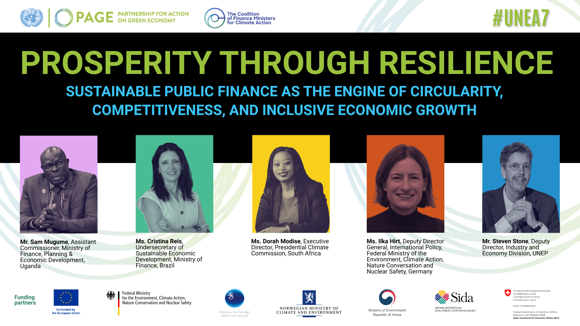 This event at UNEA-7 will spotlight public finance as the bedrock for systemic resilience, demonstrating how well-designed fiscal strategies can steer sustainable private investments, foster robust domestic business ecosystems, and create an enabling environment for decent work and inclusive economic growth. It will:
